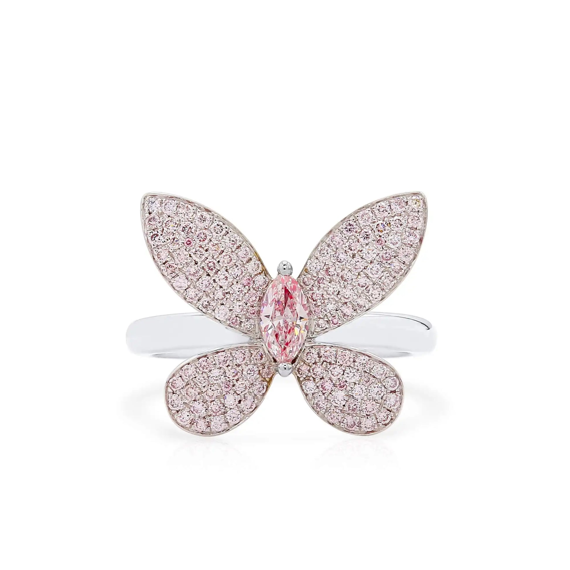 Our stunning Natural Fancy Light Pink Diamond Butterfly Ring is a work of art that seamlessly combines sophistication and beauty, bringing elegance to new heights. The centerpiece, a dazzling marquise-cut pink diamond, adorns the butterfly's body with an alluring 0.20 carats, mimicking the delicate delicacy of a butterfly. Its endearing SI clarity brings out a soft, inner glow that gives the ensemble a hint of ethereal elegance. A symphony of pink and yellow diamonds totaling 0.47 carats, shimmering like the gentle tones of morning, embellish the butterfly's wings. These diamonds' combined hue and brilliance produce a pleasing blend that adds up to a total carat weight of 0.67. made in brilliant 18K white gold.