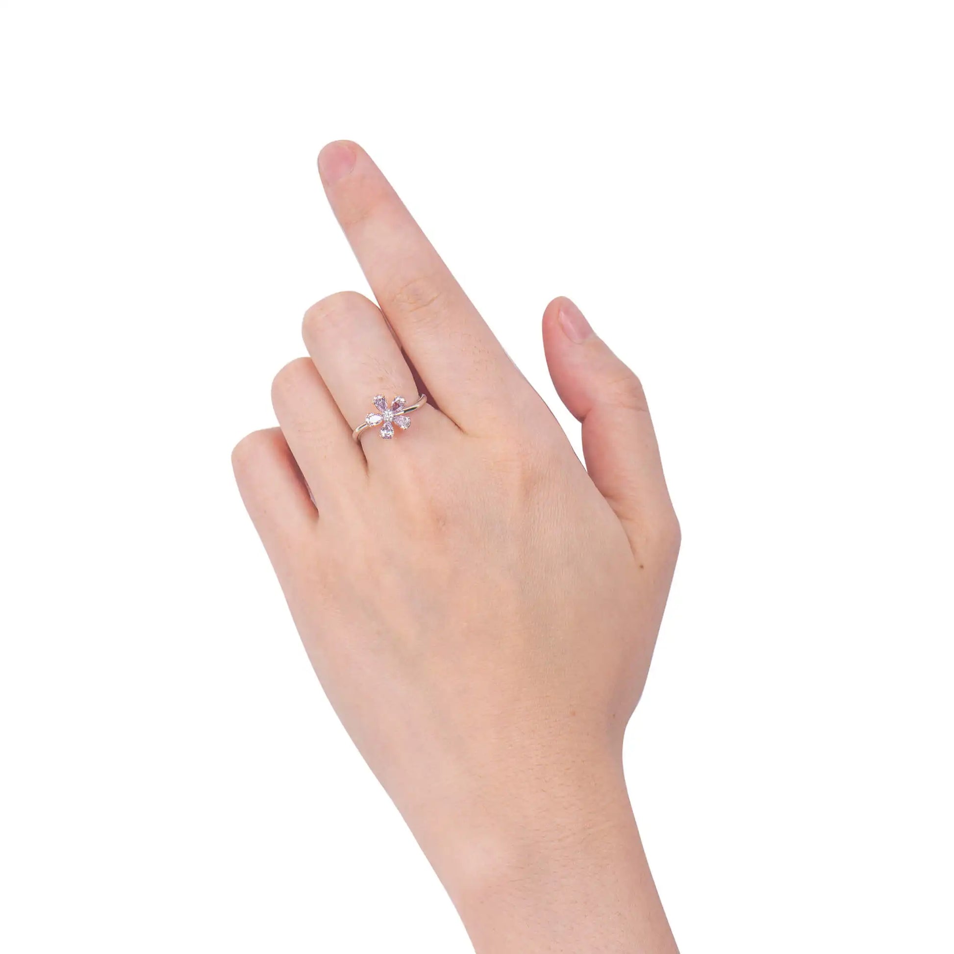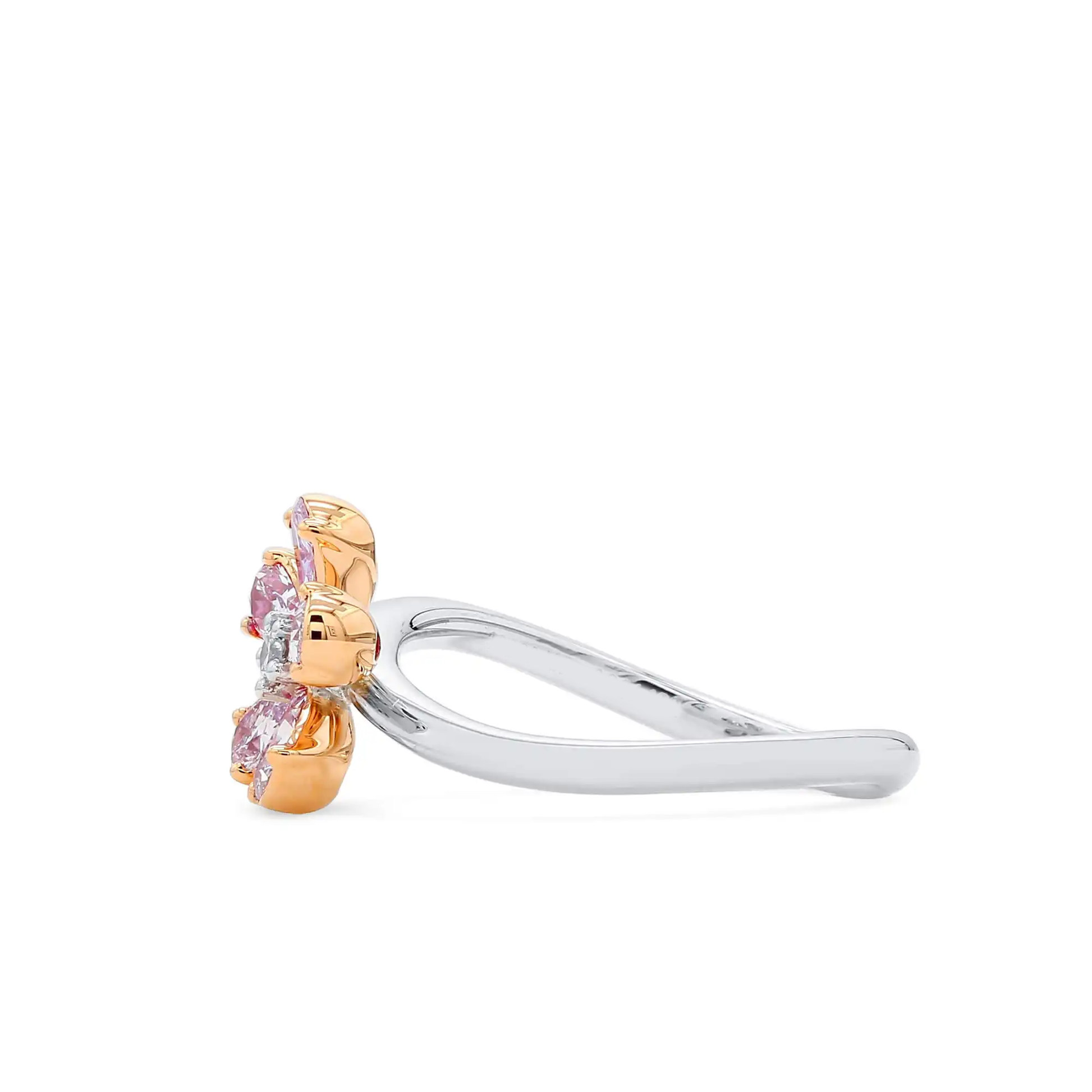Reminiscent of a magnificent flower in full bloom, indulge in the alluring charm of this Natural Fancy Pink Diamond Ring. This gorgeous necklace, which was meticulously and artistically crafted, has five stunning Pear-shaped Fancy Pink Diamonds, each of which symbolizes one of the flower's delicate petals. These 0.79 carat total weight diamonds, with VS clarity, have a captivating pink color that perfectly captures elegance and beauty. A stunning 0.04 carat white diamond with VS clarity is tucked away in the center of the floral arrangement, serving as the flower's focal point. This beauty, which is tastefully set in 18K white gold, weighs 0.83 carats total.