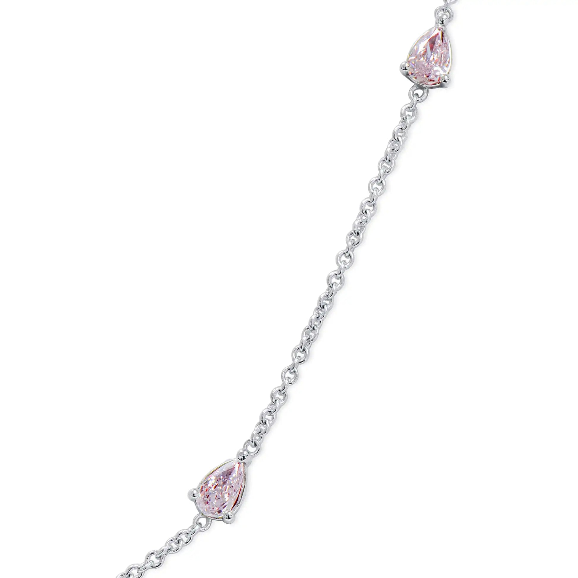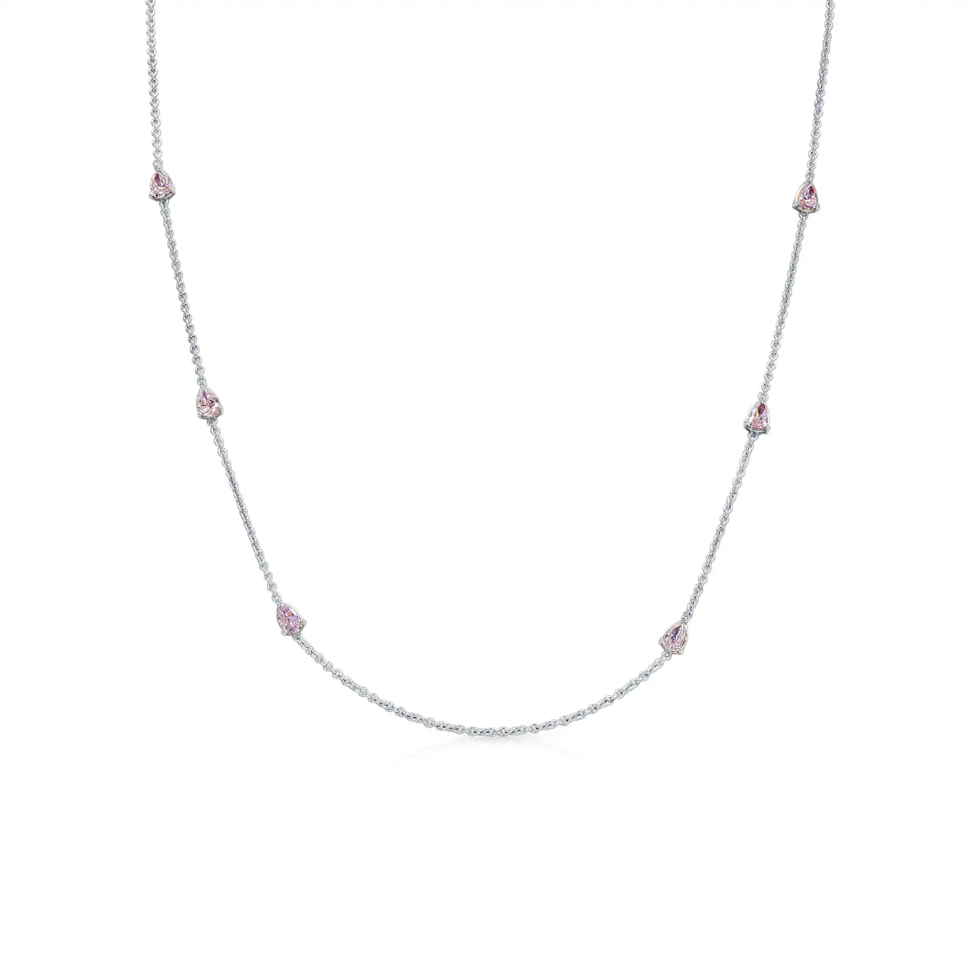 Wear the breathtaking charm of our Natural Fancy Intense Pink Diamond Necklace around your neck. It is the epitome of exceptional beauty. Six gorgeous pear-shaped pink diamonds with the highly sought-after Fancy Intense Pink hue are set in this necklace. These 0.98 carat total weight diamonds glitter brilliantly and are beautifully set in 18K white gold to bring off their vibrant color. This necklace is a statement of grace and elegance because, despite their SI1 clarity, their amazing hue steals the show. This necklace, which is ideal for adding a dash of luxury to any ensemble, features the stunning beauty of real pink diamonds set in an elegant and classic pattern.