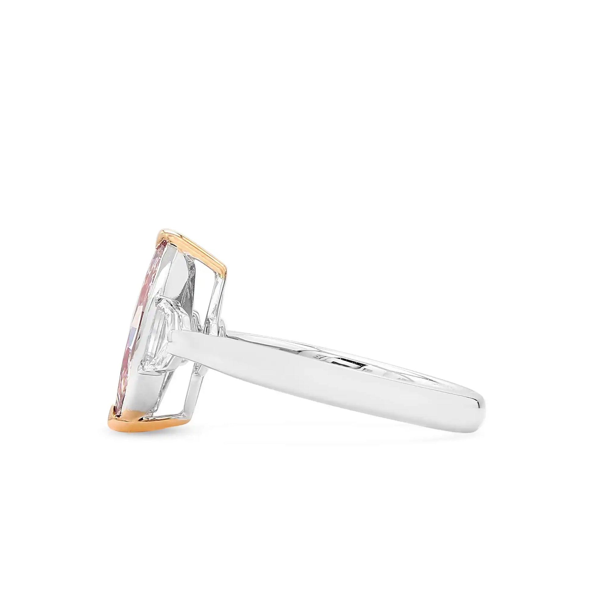 Savor the captivating elegance of this Natural Light Pink Diamond Ring, which showcases a magnificent 1.05 carat Marquise-shaped Light Pink Diamond with VS2 clarity at the center. Two White Diamonds with a total weight of 0.30 carats, exhibiting VVS clarity and D color, accentuate the attractive centerpiece and give a shimmering touch to the design. This captivating ring weighs 1.35 carats total, which reflects its brilliance and attractiveness. It is 3.94 grams of 18K White and Rose Gold that is exquisitely crafted and emanates sophistication and refinement.