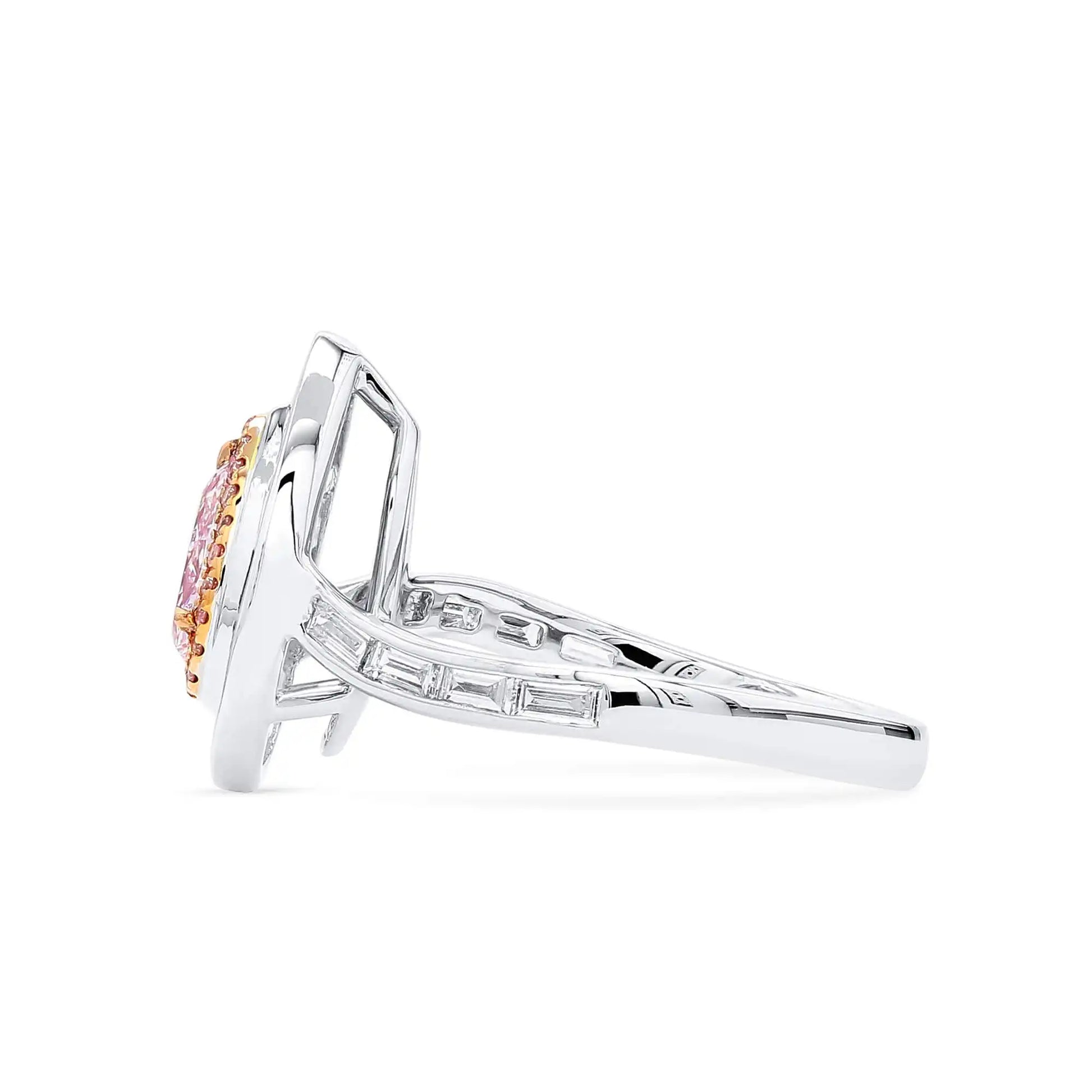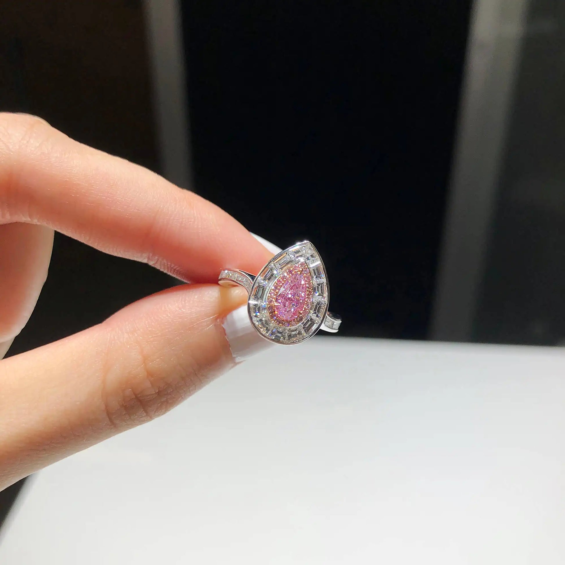 Experience the captivating charm of this Natural Very Light Pink Diamond Ring—a real masterpiece of grace. The centerpiece, which is shaped like a pear and has an amazing 0.55-carat diamond with VVS2 clarity, exudes a delicate and gentle color. Forty-two magnificent pink and white diamonds totaling 1.29 carats cover the sides, adding to its splendor. The brilliant play of hues is stabilized by the brilliant embrace of 18K white gold. This ring attests to its genuineness and excellence. The ring size is 6.25 and can be resized in accordance with our policy, so it will fit your finger perfectly. This stunning piece will elevate your look and is a testament to the everlasting appeal of pink diamonds.