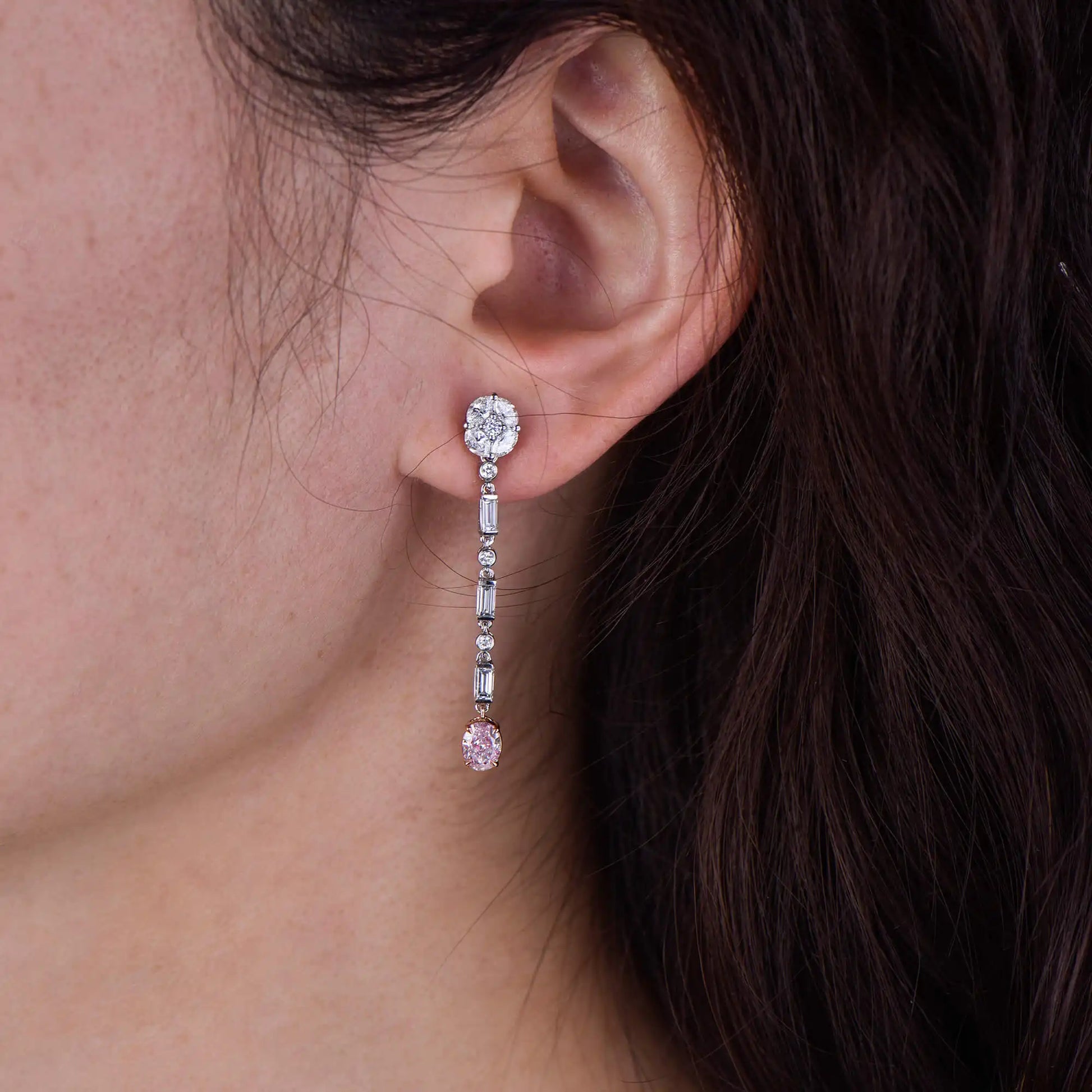Experience the understated elegance of these Natural Very Light Pink Diamond Earrings, which feature an enchanting pair of oval-shaped Very Light Pink Diamonds that have been thoughtfully chosen to radiate charm and elegance. These 1.02 carat diamonds, whose clarity ranges from VS to SI, have a charmingly subtle color that catches the eye. 22 brilliant White Diamond side stones, with a combined weight of 1.56 carats and a color grading of D-F and clarity grade of VS, accentuate the center stone. This charming pair weighs a total of 2.58 carats, which strikes a harmonious balance between the soft pink color and the dazzling white appeal. Earrings crafted in 18K White & Rose Gold, 3.07 grams in weight.