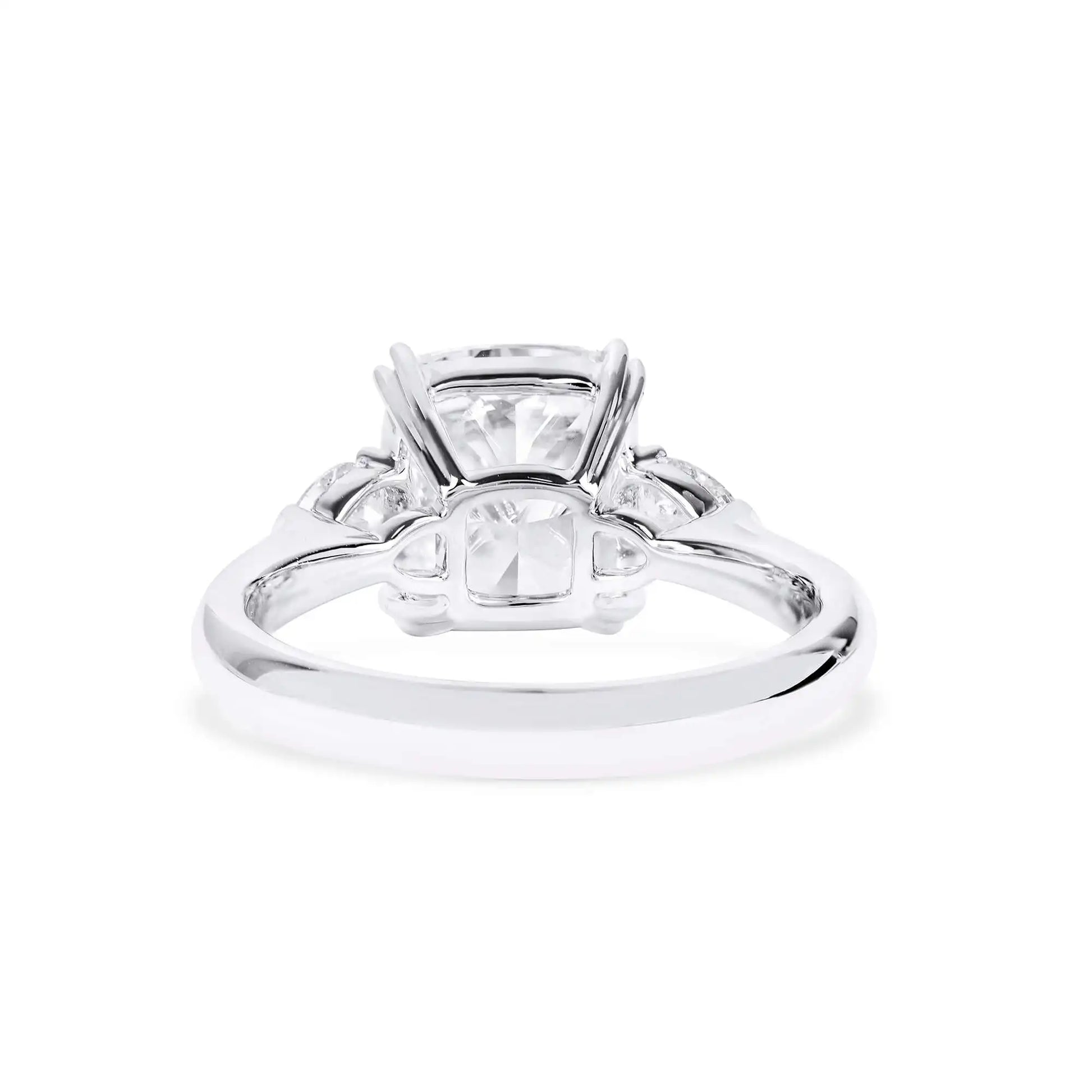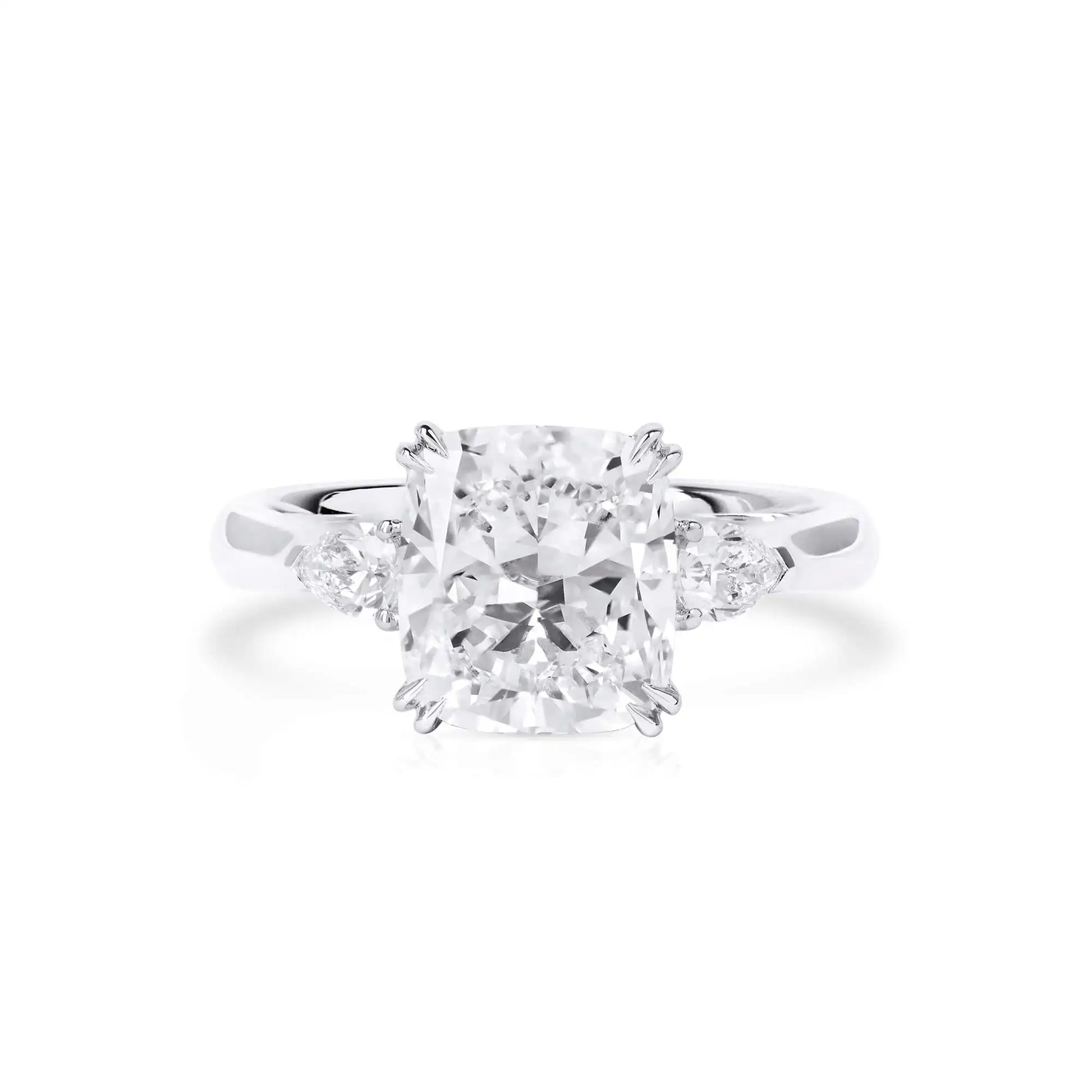 Enjoy breathtaking beauty by putting on this Natural White Diamond Ring. The centerpiece of the piece is a stunning 3.20 carat cushion-shaped white diamond that exudes a captivating brilliance due to its G color and VS1 clarity, perfectly capturing the essence of classic elegance. Two carefully cut pear-shaped white diamonds, totaling 0.29 carats, flank the main jewel, lending a subtle elegance. At a total carat weight of 3.49, this ring perfectly embodies understated elegance. Crafted with perfection in 18K White gold, the ring highlights the diamonds' brightness. The exceptional craftsmanship and originality of this ring are guaranteed. As per our policy, the resizable mechanism guarantees a comfortable fit for a ring size of 6.25, making this a valuable addition to your jewelry collection.