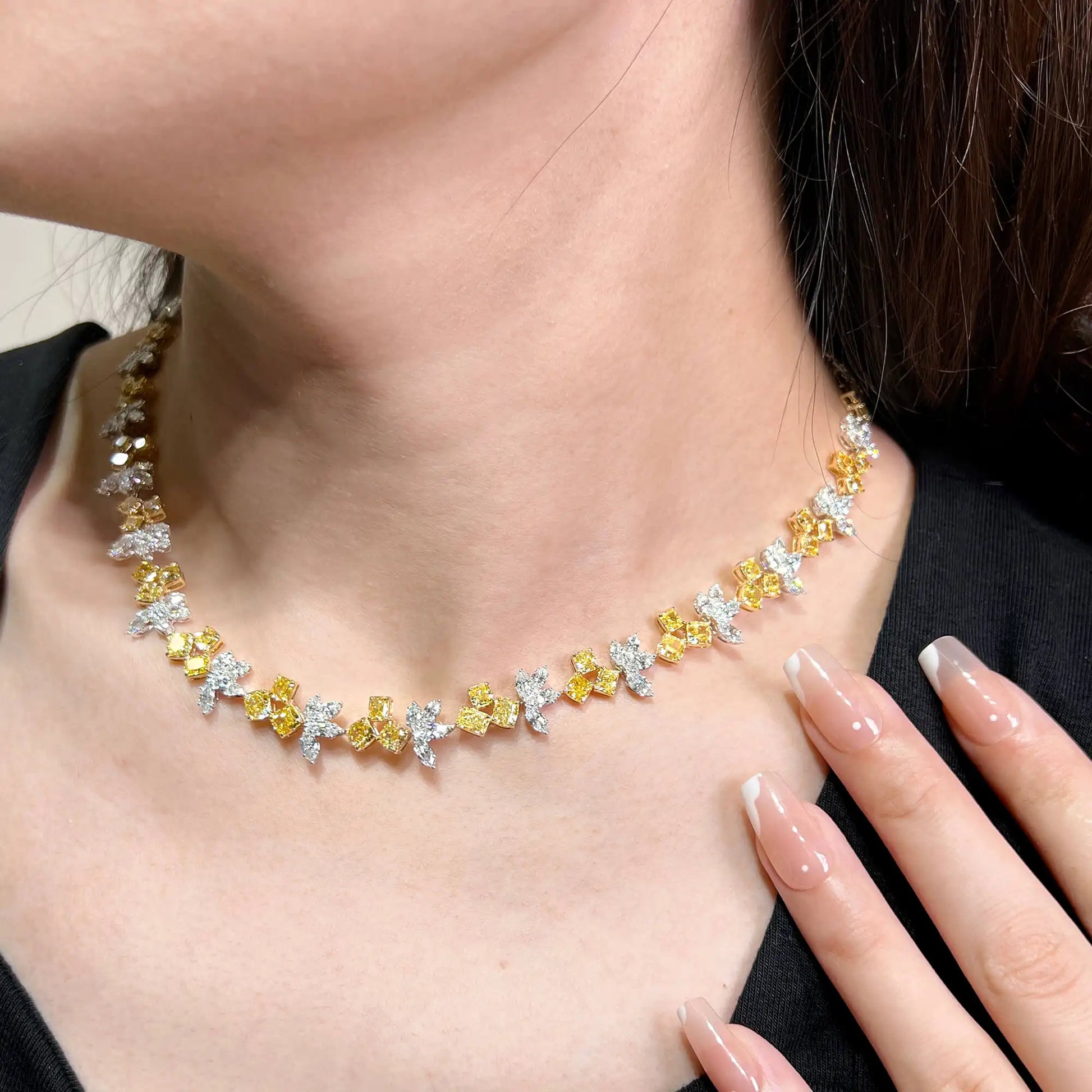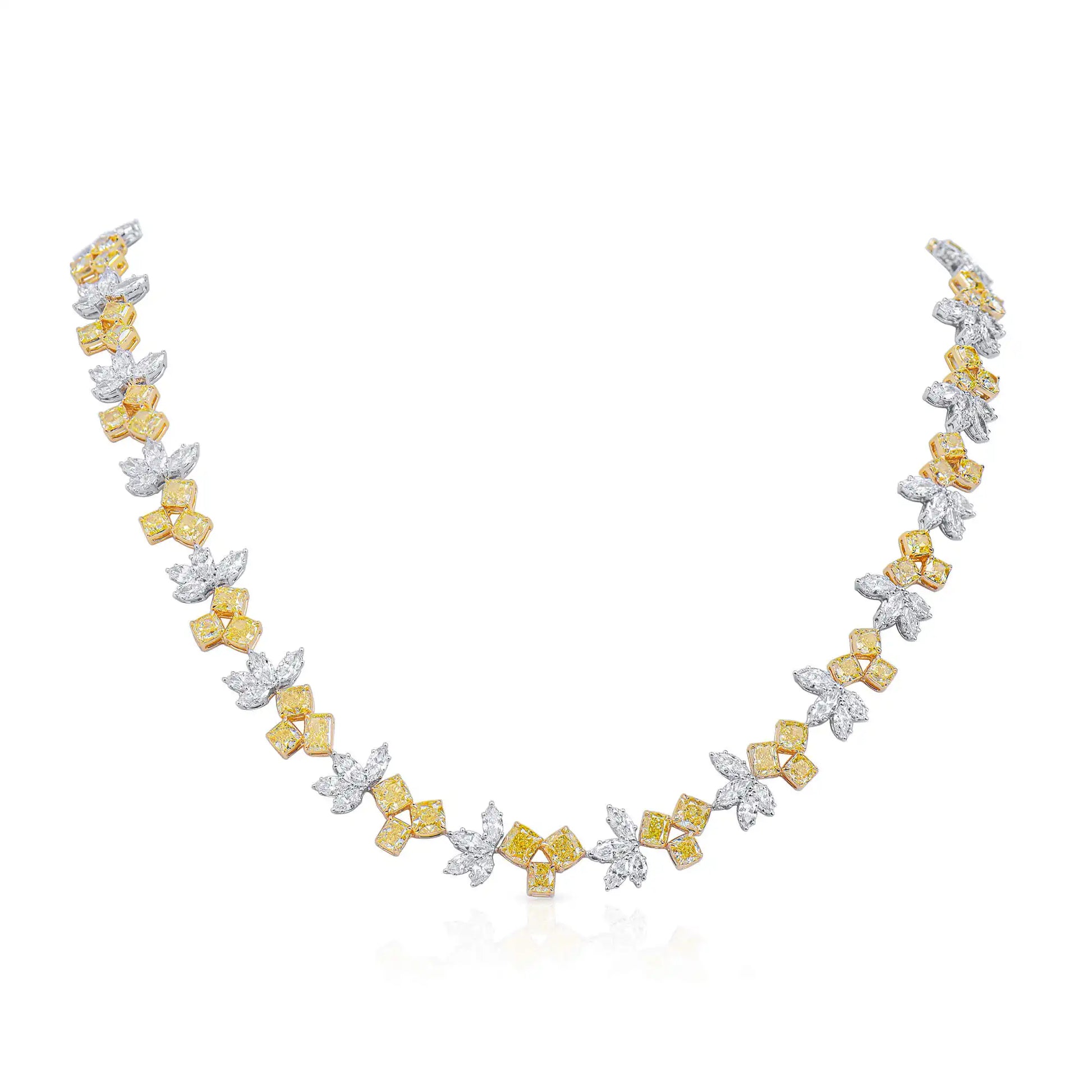 With this remarkable Natural Fancy Yellow & White Diamonds Necklace, which masterfully combines the timeless brilliance of white diamonds with the captivating warmth of yellow diamonds, you may exude elegance. The necklace features a stunning assortment of 20.73 carats of fancy yellow diamonds in different shapes. These diamonds radiate a dazzling brilliance reminiscent of the golden sun, lending radiant warmth to any event. They have VS clarity and a natural yellow tint. A total of 32.87 carats of delicate Marquise-shaped White Diamonds totaling 12.14 carats, with SI clarity and a D-F color range, come together to provide a symphony of color and sparkle. This 18K white and yellow gold necklace is more than just a piece of jewelry.